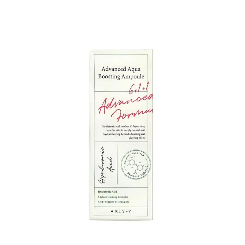 Discover deep, long-lasting hydration with the Axis-y Advanced Aqua Boosting Ampoule. Formulated with six premium natural ingredients, this lightweight ampoule features hyaluronic acid for intense moisture, Centella Asiatica to calm sensitive skin, and niacinamide to brighten and refine texture. Perfect for all skin types, it strengthens the skin barrier to prevent moisture loss, leaving your skin plump, radiant, and revitalized.